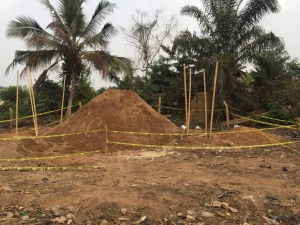 We bought 5 trips of sand on February 11, 2018. The sand needs to measure about 3 meters high prior to settling. After settling, the talud will serve as a base for the toilet to be build on. 5 trips cost Ghc 2,250 which amounted to about 430 euro.